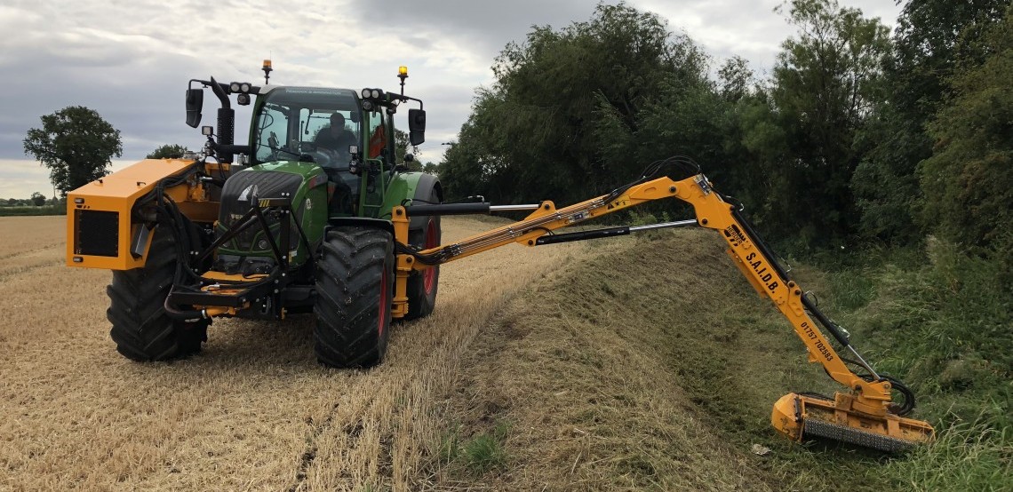 The Cavalier can be deployed for numerous purposes. A tool for maintaining ditches and roadsides is connected to the rotating jib set. The movements of the jibs and tool can be controlled with extreme precision from the tractor cabin by means of a simple, electronically operated joystick. The mowing arm can be rotated to the back and fixed in place for safe, secure transportation.