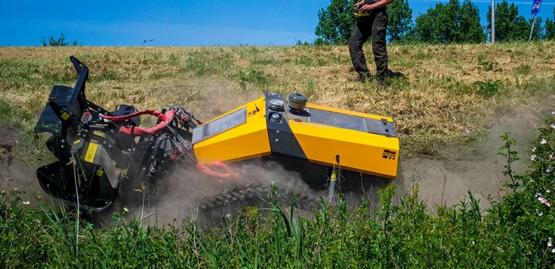 The CR10 is a versatile tool carrier from Herder that can be used for the most diverse purposes and under all circumstances. From mowing verges and ditches to removing stumps. The CR10 is remotely controlled, allowing you to choose a position with the best view of the work and a safe environment. The powerful engine, adjustable high grip tracks and compact design make the CR10 an extremely reliable machine.